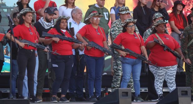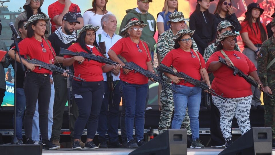 Las mujeres, quienes sostenían sendas armas y portaban franelas rojas alusivas al chavismo, estaban sobre un escenario instalado por el gobierno en la avenida Bolívar de Caracas, una emblemática vía para el oficialismo donde este martes se concentraron distintos grupos que previamente se movilizaron por la capital en rechazo a las que llaman "amenazas" de Estados Unidos.