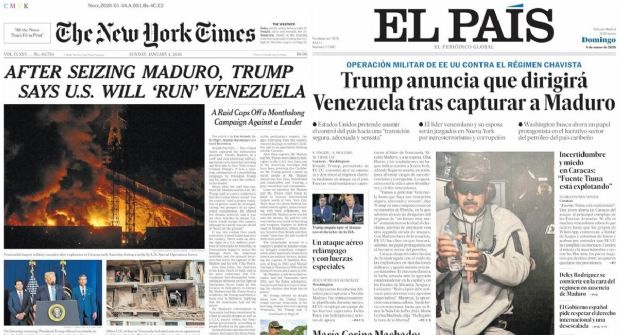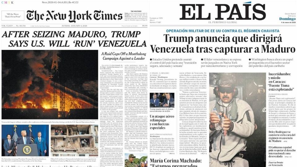 La captura del presidente de Venezuela, Nicolás Maduro, ocupó el espacio principal de las primeras planas internacionales, junto a fotografías donde se muestra al exlíder venezolano siendo trasladado a Estados Unidos, donde ya está recluido en una prisión. Además, se destacan los dichos del presidente de EU, Donald Trump, quien dijo que gobernará el país venezolano y mostró interés por el petróleo de dicho país.