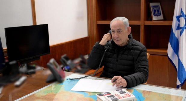 La oficina de Netanyahu publicó una foto en la que se le ve hablando por teléfono en su despacho con un mapa de la región sobre la mesa, una carpeta de folios y el libro Aliados en guerra, sobre las potencias aliadas durante la Segunda Guerra Mundial (1939-1945).