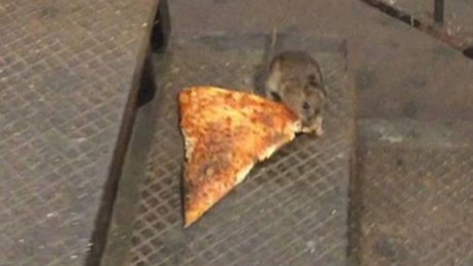 Este fin de semana, usuarios del metro en la ciudad de Nueva York captaron a una enorme rata intentando bajar las escaleras hacia los trenes mientras llevaba una rebanada completa de pizza.