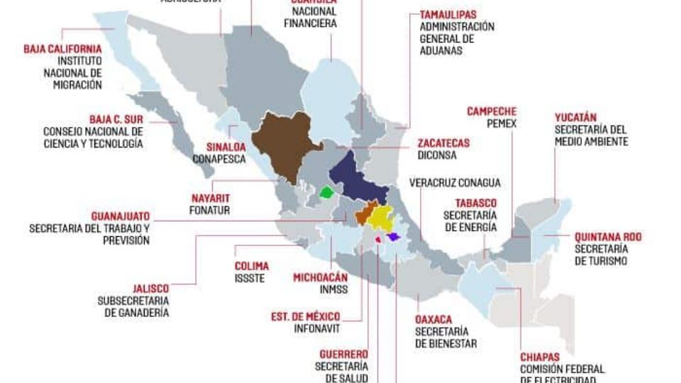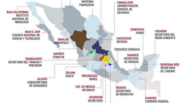 Otros estados que esperan la llegada de las secretarías son: Quintana Roo, que recibirá a la Secretaría de Turismo; Yucatán, la Secretaría del Medio Ambiente; a Campeche llegará Pemex; a Chiapas, la Comisión Federal de Electricidad; Veracruz espera la Comisión Nacional del Agua; Oaxaca la Secretaría de Desarrollo Social; Tlaxcala la Secretaría de Cultura; Michoacán espera al IMSS; Colima recibirá al ISSSTE; Aguascalientes, la CONADE; Querétaro la Secretaría de la Función Pública; Zacatecas, Diconsa; a San Luis Potosí llega la Secretaría de Comunicaciones y Transporte; a Coahuila Nafin; Durango recibirá la Comisión Forestal; Nayarit al Fondo Nacional de Fomento al Turismo; a Sinaloa llega la Comisión Nacional de Acuacultura y el Instituto Nacional de la Pesca; a Sonora, la secretaría de Agricultura; a Baja California Sur, llega el Consejo Nacional de Ciencia y Tecnología; a Baja California, el Instituto Nacional de Migración; mientras que a Chihuahua llegará la secretaría de Minería.