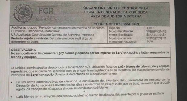 La auditoría FGR/OIC/AAI/012/2020 realizada por el Órgano Interno de Control de la FGR menciona que la institución, tuvo de plazo siete meses para informar en dónde se encuentran los bienes adquiridos con dinero de los contribuyentes. Sin embargo, a la fecha, es una incógnita.