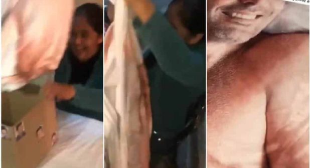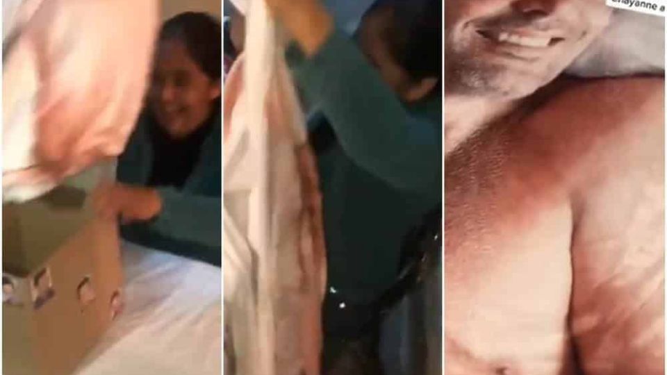 "¿Qué es esto?; ésto mi cobija", grita una mujer al abrir una caja de regalo que le entregó su hija y darse cuenta que se trata de una frazada con la imagen del cantante puertorriqueño, Chayanne.