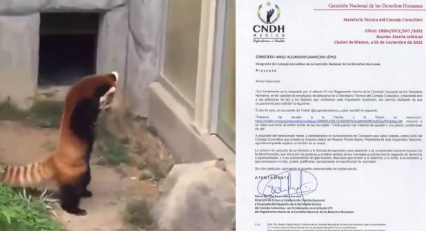 “La @CNDH por oficio me pide explicación de tuitear este video donde un lindo panda rojo está tratando de asustar a una piedra y la piedra no reacciona. Yo digo que el video es lindo. Creo que l@s 6 alt@s funcionari@s de la CNDH me acosan por otra razón y no por el video”, respondió en Twitter el consejero Saavedra.