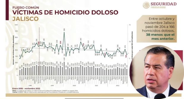 “En el caso de Jalisco se pasó de 204 a 166, es decir, 38 homicidios dolosos menos que el mes anterior”, explicó Mejía Berdeja durante la conferencia mañanera del presidente Andrés Manuel López Obrador.