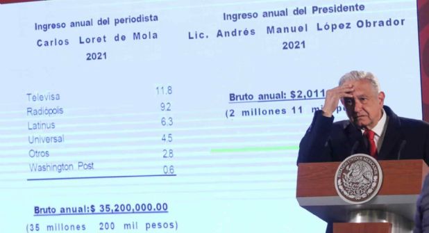 El presidente Andrés Manuel López Obrador exhibió en conferencia mañanera los supuestos ingresos del periodista Carlos Loret de Mola, que de acuerdo con el especialista Francisco Varela, del Instituto Mexicano para la Competitividad (Imco), el mandatario cayó en una serie de posibles violaciones legales tanto de la Constitución como leyes y códigos.