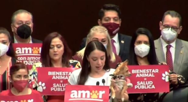 Al subir a tribuna, la legisladora subió a tribuna un perro raza Chihuahua cabeza de venado para argumentar que en el país existen alrededor de 23 millones de perritos y de gatitos y solo 30% de ellos cuenta con un hogar.