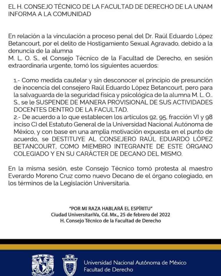 El Consejo Técnico de la Facultad de Derecho sesionó este viernes a las 10:00 horas para definir la situación jurídica y académica de López Betancourt, quien el jueves fue vinculado a proceso por el delito de hostigamiento sexual agravado.