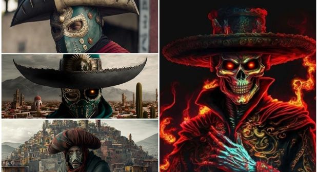En este caso, la imagen que la inteligencia artificial creó de México como villano de una película de terror fue similar a una calavera maligna cubierta de llamas. La calavera se encuentra vestida con lo que parece ser un traje típico mexicano con un sombrero de charro.