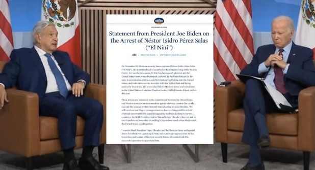 Este jueves, el presidente estadounidense, Joe Biden, felicitó a su homólogo mexicano, Andrés Manuel López Obrador (AMLO) por la detención de Néstor Isidro Pérez Salas, alias “El Nini”, quien es el jefe de seguridad del grupo criminal integrado por cuatro hijos del narcotraficante Joaquín “El Chapo” Guzmán.