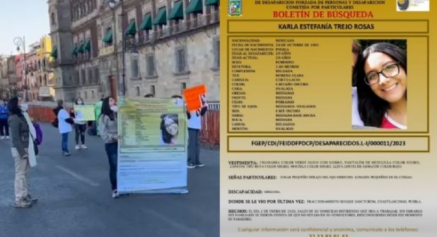 El 2 de enero pasado, Karla Estefanía Trejo Rosas, de 29 de años de edad, desapareció en Cuautlancingo, Puebla. Este miércoles 15 de febrero, familiares protestaron frente a Palacio Nacional para denunciar falta de resultados para hallar con vida a la joven nutrióloga. La protesta provocó afectaciones en el primer cuadro de la capital.