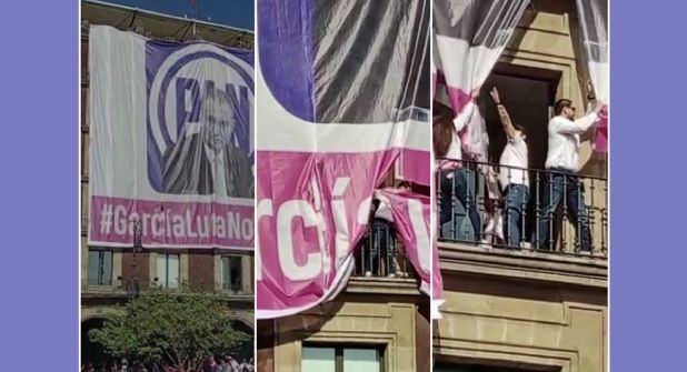 La manta que tenía el logotipo del Partido Acción nacional (PAN) y el hashtags #GarcíaLunaNoSeToca fue destrozada por un grupos de ciudadanos que defienden al Instituto Nacional Electoral (INE), mientras les echaban porras desde abajo: ¡si se puede! ¡si se púede! coreaban para animarlos a seguirla jalando y destruirla.