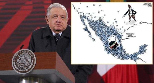 Este artículo fue acompañado de una carícatura reveladora en la que AMLO da la espalda a la producción de fentanilo en México.