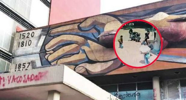 Estudiantes paristas de la UNAM fueron sorprendidos infraganti mientras alteraban uno de los murales de Alfaro Siqueiros que cubren el edificio de la Rectoría.