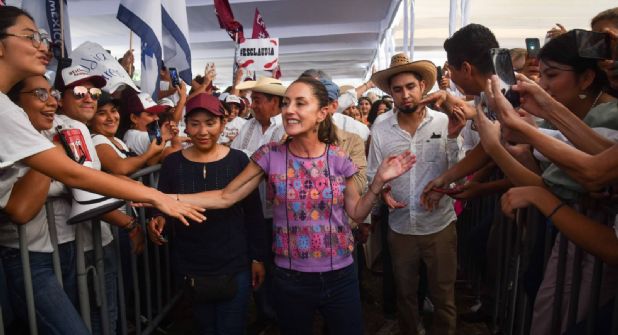 “Y algunos se preguntan, porque son cinco hombres y una mujer, y se preguntan: “Pues, ¿cómo que una mujer va arriba en las encuestas?” Pues es que ya cambió México, ya es tiempo de las mujeres, ya no es tiempo del México machista. Ahora, como decimos, México se escribe con “M” de mujer y con “M” de Morena, continuó.