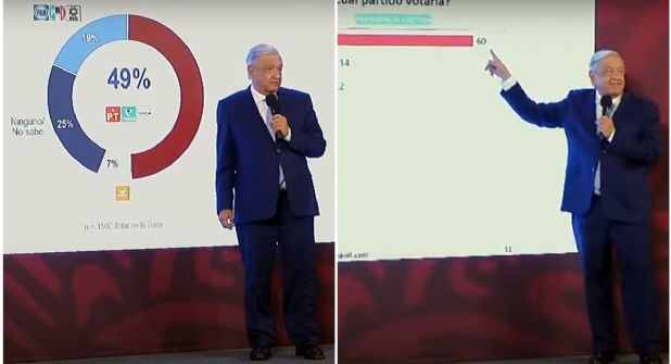Pese a estar inhabilitado por el INE para hablar sobre las elecciones del 2024 en sus conferencias mañaneras, el presidente Andrés Manuel López Obrador presentó este miércoles 26 de julio desde Palacio Nacional, unas encuestas de preferencia de voto en las que se le da la ventaja a Morena, partido que lo impulsó a la presidencia.