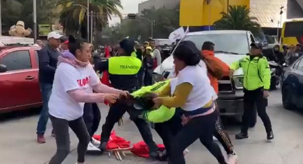 En el video que se ha difundido por redes sociales, se observa a un grupo de 7 personas, 4 mujeres y 3 hombres, agarrar a golpes y jalones a 3 elementos de la Secretaría de Seguridad Ciudadana, quienes son clemente distinguibles entre la multitud por utilizar chalecos fluorescentes de color amarillo.