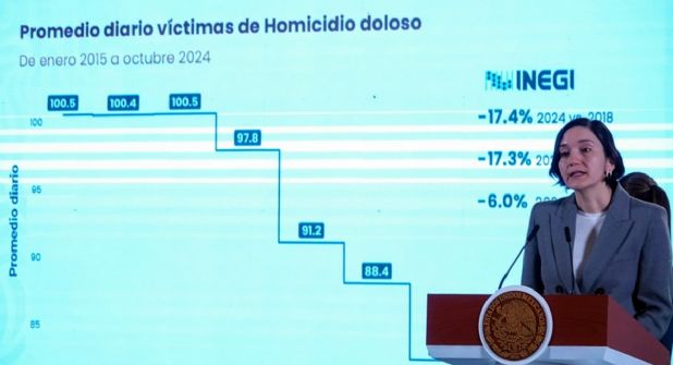 La subsecretaria de Seguridad, Clara Luz Flores Carrales, informó que el promedio diario de homicidios ha disminuido un 17.3% desde 2019, resaltando una tendencia a la baja en los índices de violencia en el país. En febrero de 2019, el promedio diario de homicidios alcanzó su punto máximo con 100.9 muertes, mientras que, al corte de octubre de 2024, la cifra se redujo a 83 homicidios diarios.