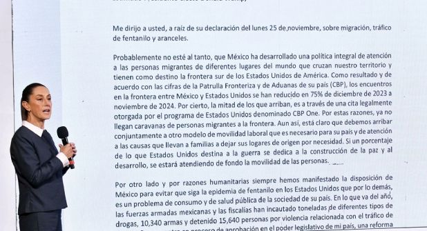 La presidenta Claudia Sheinbaum adelantó que enviará una carta dirigida al presidente electo de los Estados Unidos, Donald Trump, en la que responde a las recientes declaraciones del mandatario sobre migración, tráfico de fentanilo y la posible imposición de aranceles a productos mexicanos.