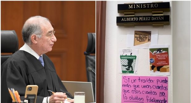 A dos días de que el ministro de la Corte, Alberto Pérez Dayán, evitara que se invalidara la reforma judicial promovida por la Cuarta Transformación que ahora encabeza la presidenta Claudia Sheinbaum, aparecieron diversos carteles pegados en su oficina del máximo tribunal del país para llamarlo “traidor”.