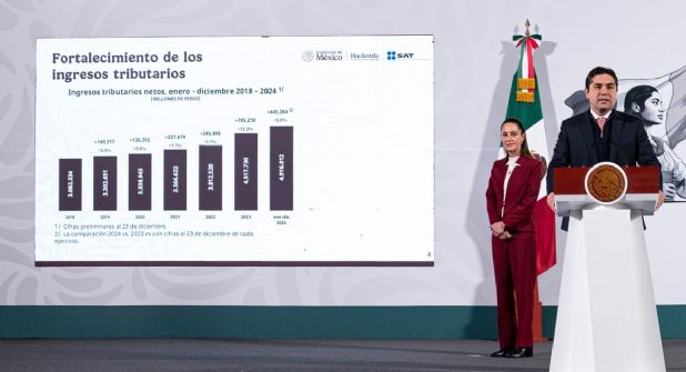 Tras destacar que hasta el 23 de diciembre de 2024 la recaudación de impuestos de este año fue de 4.9 billones de pesos, la presidenta Sheinbaum anunció que tiene una meta similar para el año entrante: la de incrementar los recursos tributarios en unos 445 mil millones de pesos.