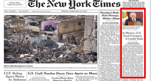 El reportaje por el que el presidente Andrés Manuel López Obrador exhibió el número de teléfono de la periodista Natalie Kitroeff, del New York Times, fue destacado en la portada de este viernes 23 de febrero del diario estadounidense. El reportaje aborda el presunto financiamiento del cártel de Sinaloa a la campaña presidencial de López Obrador en las Elecciones de 2018.