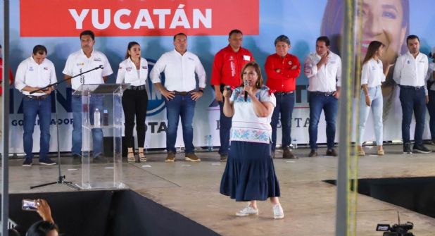 La ingeniera llegó desde Progreso, donde habló de energías renovables, hasta Ticul en su “Xochibus”. Al bajar, regaló fotos, saludos y abrazos a las dientas de personas que la esperaban a ella y al candidato local.