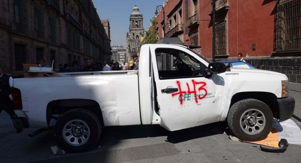 Luego de que se intentara dispersar a los manifestantes interponiendo una camioneta de la Comisión Federal de Electricidad (CFE), los normalistas utilizaron el vehículo para derribar la entrada. ÚNETE A NUESTRO CANAL DE WHATSAPP. EL PODER DE LA INFORMACIÓN EN LA PALMA DE TU MANO