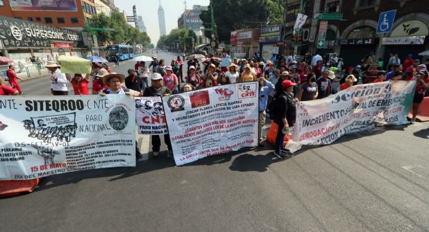 Los maestros de la Coordinadora Nacional de Trabajadores de la Educación (CNTE) marcharon desde San Cosme hacia el Zócalo, llegando alrededor de las 12:40 pm del 15 de mayo, Día del Maestro. Enfrentaron un Palacio Nacional protegido por vallas metálicas de 3 metros de altura, un calor de 30 grados y una contingencia ambiental, donde instalaron un platón indefinido.