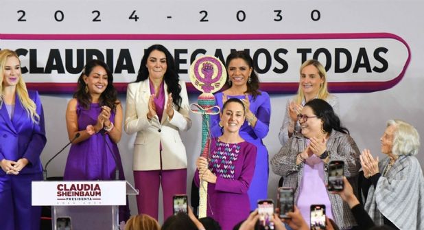 Previó a su discurso, Sheinbaum recibió de parte de la senadora y diputada federal electa, Olga Sánchez Cordero, un bastón de mando simbólico elaborado por mujeres indígenas oaxaqueñas.