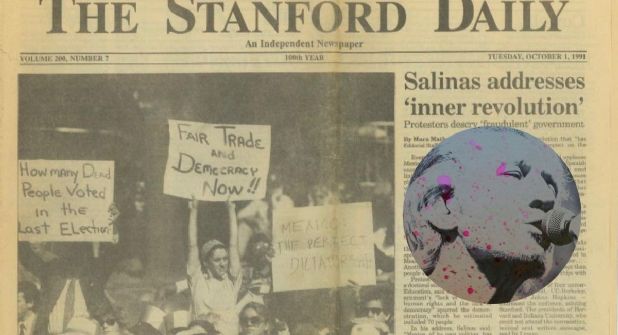 En la portada del periódico The Stanford Daily, Claudia Sheinbaum aparece levantando una cartulina con la frase “Comercio justo y democracia ahora” en 1991.