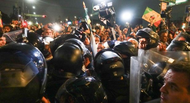 Manifestantes que rechazan la iniciativa de reforma judicial se enfrentaron con policías de la Ciudad de México en las inmediaciones de la sede alterna de Xicoténcatl, en el centro de la capital del país, al intentar entrar al salón de plenos de la antigua sede del Senado de la República.