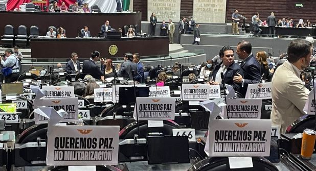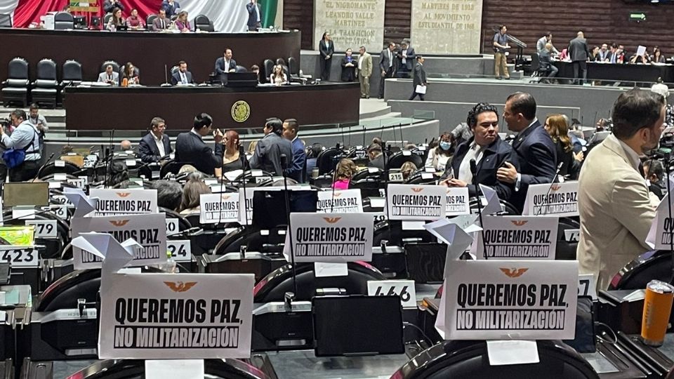 En el inicio de la discusión de la reforma para que la Guardia Nacional se adscriba a la Sedena, diputados de oposición tienen en sus curules una pancarta que dice “Queremos La Paz. No a la Militarización”.