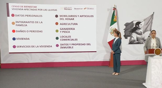 La secretaria del Bienestar, Ariadna Montiel, informó que este lunes iniciará el censo para identificar a las personas afectadas por las lluvias y gestionara los apoyos en los estados de Hidalgo, Puebla, Querétaro, San Luis Potosí y Veracruz.