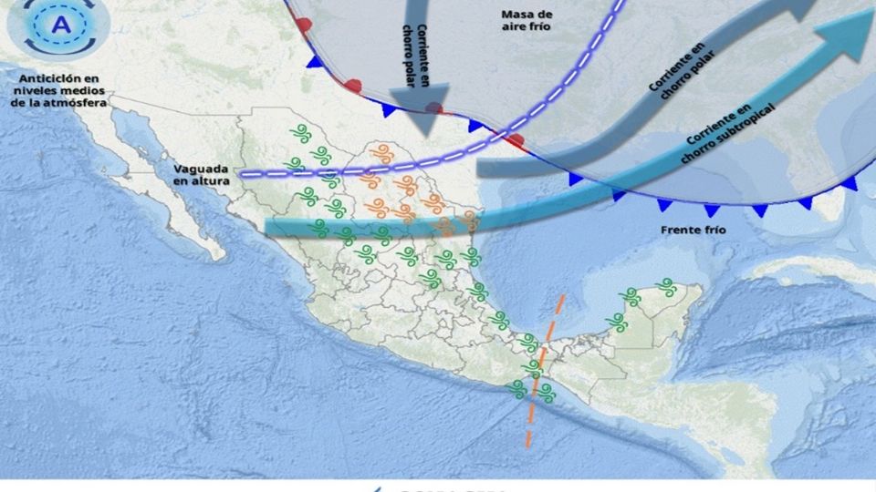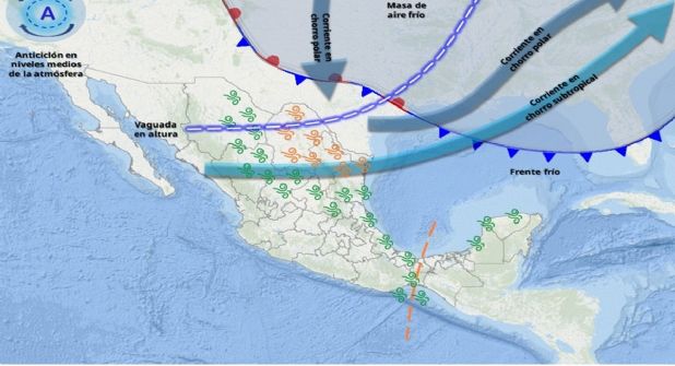Por otro lado, el ingreso de humedad del océano Pacífico originará lluvias y chubascos dispersos en estados del occidente y sur del territorio nacional.