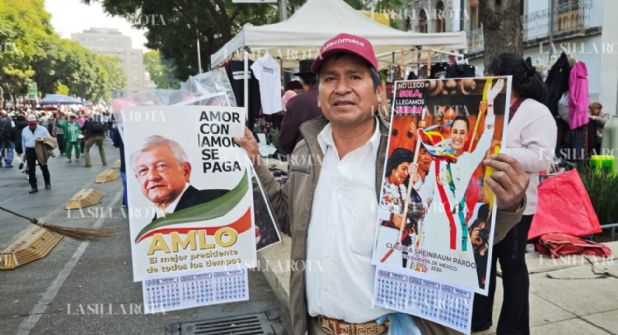 Entre los asistentes que avanzaban hacia el Zócalo estaba Herminio Becerril, artesano y jornalero mazahua de 58 años. “Venimos de Atlacomulco. Los calendarios son una imagen para nuestro país”, explicó mientras mostraba las fotografías de Sheinbaum y de López Obrador.