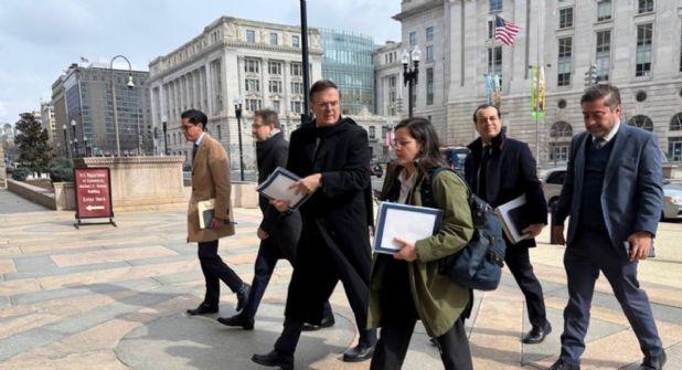 Ebrard acompañó su mensaje con una foto en la que se le ve caminando en Washington con una carpeta con documentos, acompañado por miembros de la delegación mexicana.