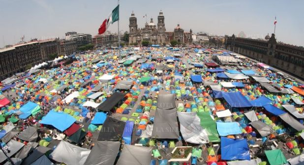La mayor parte de los maestros que se encuentran en paro pertenecen a las Sección 22 de la CNTE Oaxaca. La plancha del Zócalo luce abarrotada con cientos de carpas y casas de campaña de profesores de la CNTE que desde la madrugada llegaron al centro.