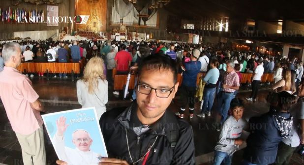 Uno de los cientos de fieles que acudió a la misa en la Basílica de Guadalupe fue Fernando, quien cargaba una imagen del Santo Padre y escuchó atento la misa, que culminó con un minuto de aplausos y replicando en 100 ocasiones las campañas de la Antigua Basílica.