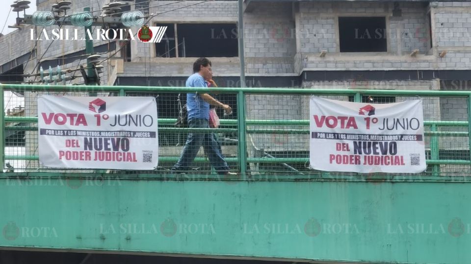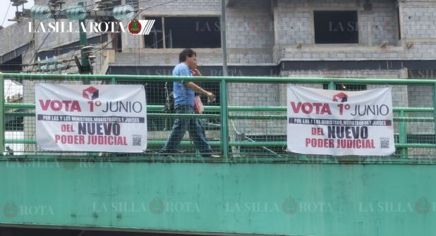 “Vota 1 de junio por las y los ministros, magistrados y jueces del nuevo poder Judicial”, se lee en las mantas y carteles con fondo blanco y colores guinda que rodean el mensaje, colocadas lo mismo en una ventana de un módulo y en las rejas del parque.