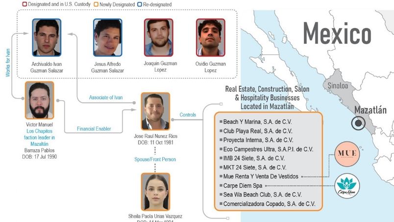 Entre los señalados se encuentra Víctor Manuel Barraza Pablos, presunto jefe de plaza de Los Chapitos en Mazatlán. También fue sancionado el empresario José Raúl Núñez Ríos, a quien se le atribuye el financiamiento de las operaciones del grupo en la región a través de empresas de bienes raíces, construcción y hospitalidad. Según OFAC, Núñez utiliza a su esposa, Sheila Paola Urias Vázquez, como propietaria nominal de varias de estas empresas.