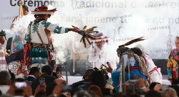Los ministros recibieron una limpia con orientación a los cuatro puntos cardinales, y luego se hincaron para pedir por ellos. Como en una ceremonia religiosa, Loretta Ortiz extendió las manos para tomar las de Giovani Azael Figueroa y Lenia Batres, mientras Estela Ríos y Esquivel inclinaban la cabeza. Al concluir la entrega, varios se abrazaron.