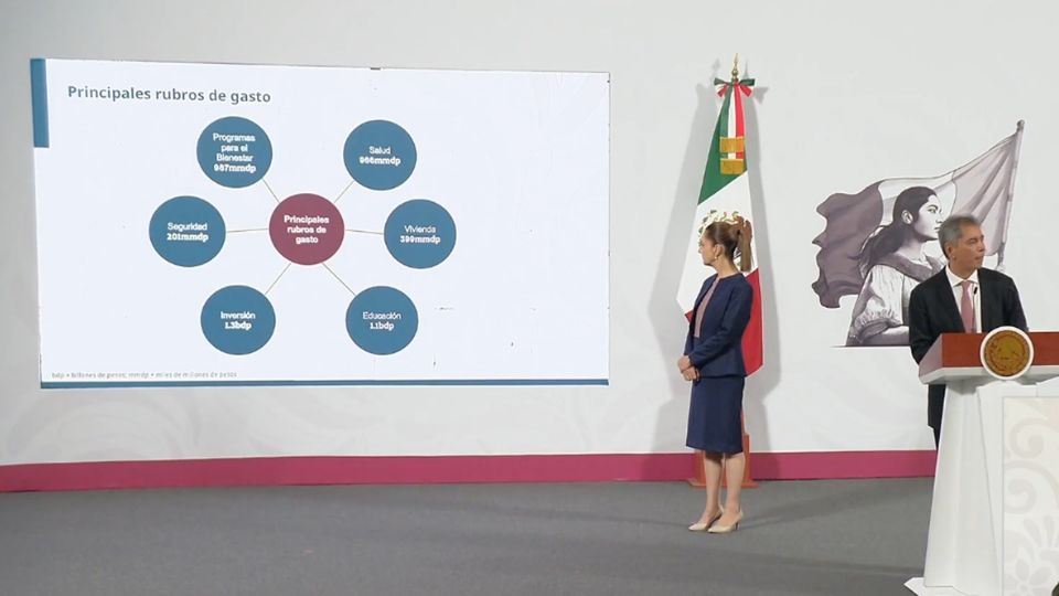 El secretario de Hacienda, Édgar Amador Zamora detalla este miércoles durante la mañanera el Paquete Económico 2026 entregada el lunes a la Cámara de Diputados donde se completa que al menos 2.5 por ciento del Producto Interno Bruto (PIB) se destine a los programas sociales.