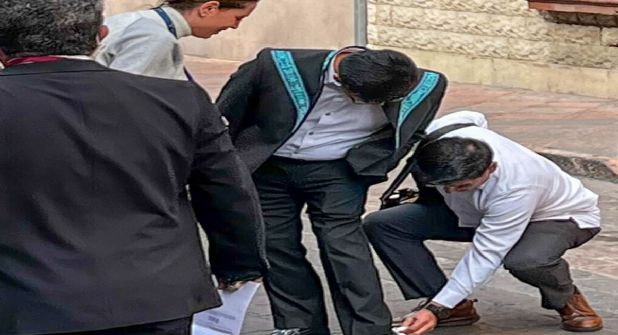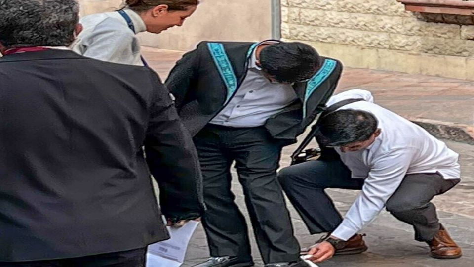 Las imágenes difundidas muestran a dos personas limpiando los zapatos del ministro presidente Hugo Aguilar Ortiz momentos antes de ingresar al acto conmemorativo por el aniversario de la Constitución.