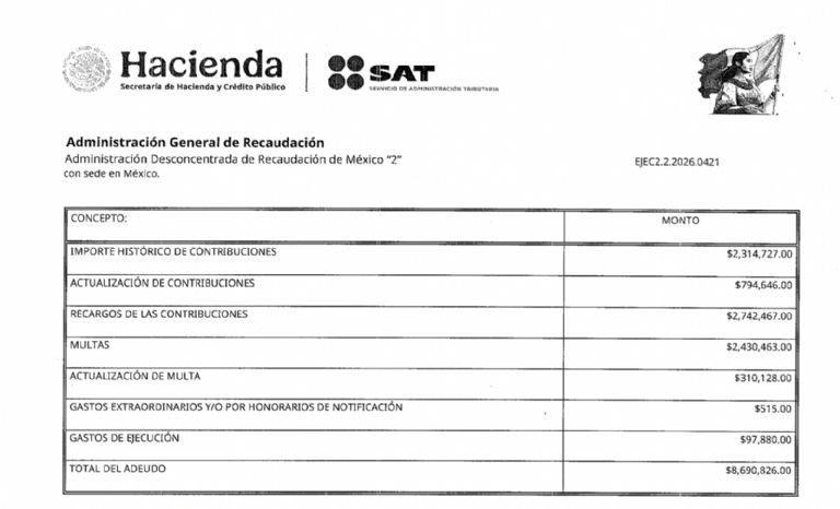 Para febrero de 2026, el SAT ya había emitido un mandamiento de ejecución, es decir, el punto en el que la autoridad puede embargar bienes para recuperar el adeudo.