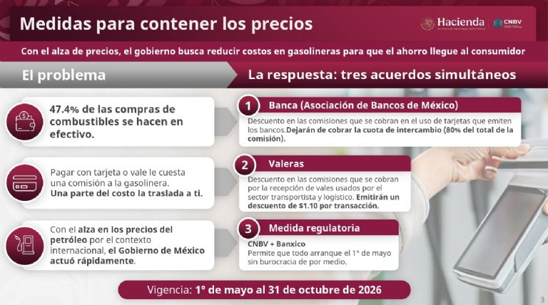 Este mañana, la presidenta Claudia Sheinbaum anunció un acuerdo entre el gobierno federal, la Asociación de Bancos de México (ABM) y empresas emisoras de vales para reducir las comisiones cobradas a las gasolineras por pagos con tarjeta y vales, medida con la que busca evitar un incremento mayor en los precios de la gasolina y el diésel.