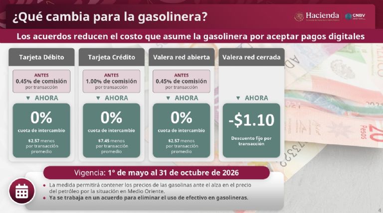 “El ahorro por litro proviene de la eliminación de comisiones bancarias que antes absorbían las estaciones de servicio en cada transacción con tarjeta. Si la estación decide trasladarlo, el precio al consumidor podría disminuir entre 0.10 y 0.28 pesos por litro”, expuso Ramsés Pech.