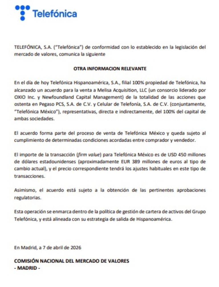 De acuerdo con el reporte enviado a la Comisión Nacional del Mercado de Valores (CNMV), la transacción incluye la totalidad de las acciones que la empresa poseía en Pegaso PCS y Celular de Telefonía, sociedades que integran el negocio de Telefónica México.