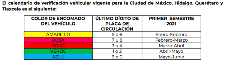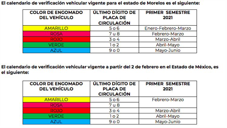 La Comisión Ambiental de la Megalópolis destacó que en la Zona Metropolitana del Valle de México (CDMX y Edomex), debido a la pandemia, durante 2020 cada vehículo se presentó a la verificación vehicular solo una vez, por lo que para realizar la verificación vehicular del primer semestre del 2021, solo se deberá presentar el certificado de la verificación del primer o segundo semestre del 2020.