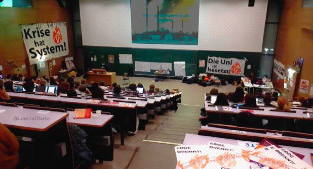 Tuve oportunidad de platicar con algunos jóvenes que encabezan una de estas protestas, el grupo “La Tierra arde, ocupar la Uni” (Erde Brennt, Uni Besetzen). Muchos de ellos, de la misma edad que mis estudiantes de licenciatura, reflejan la desesperación y ansiedad por cambio climático, ante las fulminantes noticias que día a día llegan a sus redes sociales. Pero vienen con la necesaria estrategia. O al menos, se permiten escuchar a otros para redirigir el timón. Profesores de cátedra muestran su apoyo e imparten clases sobre temas ambientales abiertas a todos. Grupos de activistas imparten lecciones de baile y sensibilización. Psicólogos informan sobre los estragos de vivir bajo el miedo y estrés, ofreciendo ayuda profesional. Noticieros, programas de radio, podcasts, y hasta debates públicos se transmiten desde el aula tomada. La mayoría replica la información e invitan a otros a unirse. Usan redes para hacer “en vivos” y guardar los contenidos. Utilizan procesos participativos y democráticos. Otros traen comida, cobijas limpias, café. Entre estas muestras de solidaridad, me obsequian calcomanías para pegar en postes y baños públicos. Es entonces cuando les hago la pregunta más difícil: ¿y hasta cuándo piensan ocupar el aula?